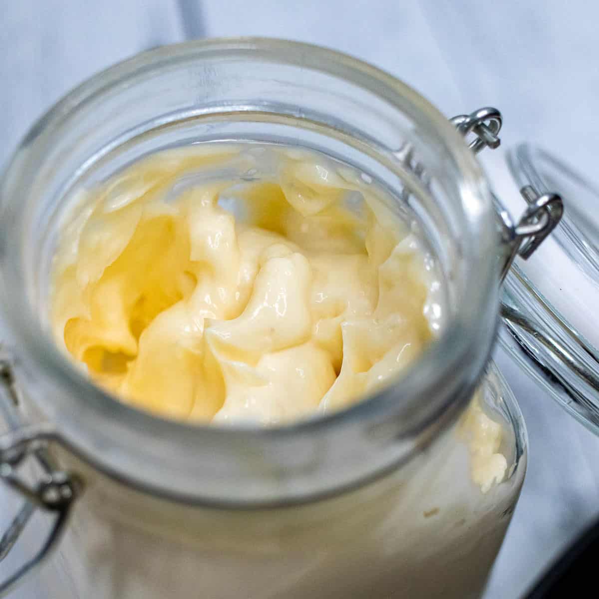The homemade mayo can be used immediately, but for best results transfer to an airtight container and refrigerate it for a few hours first.