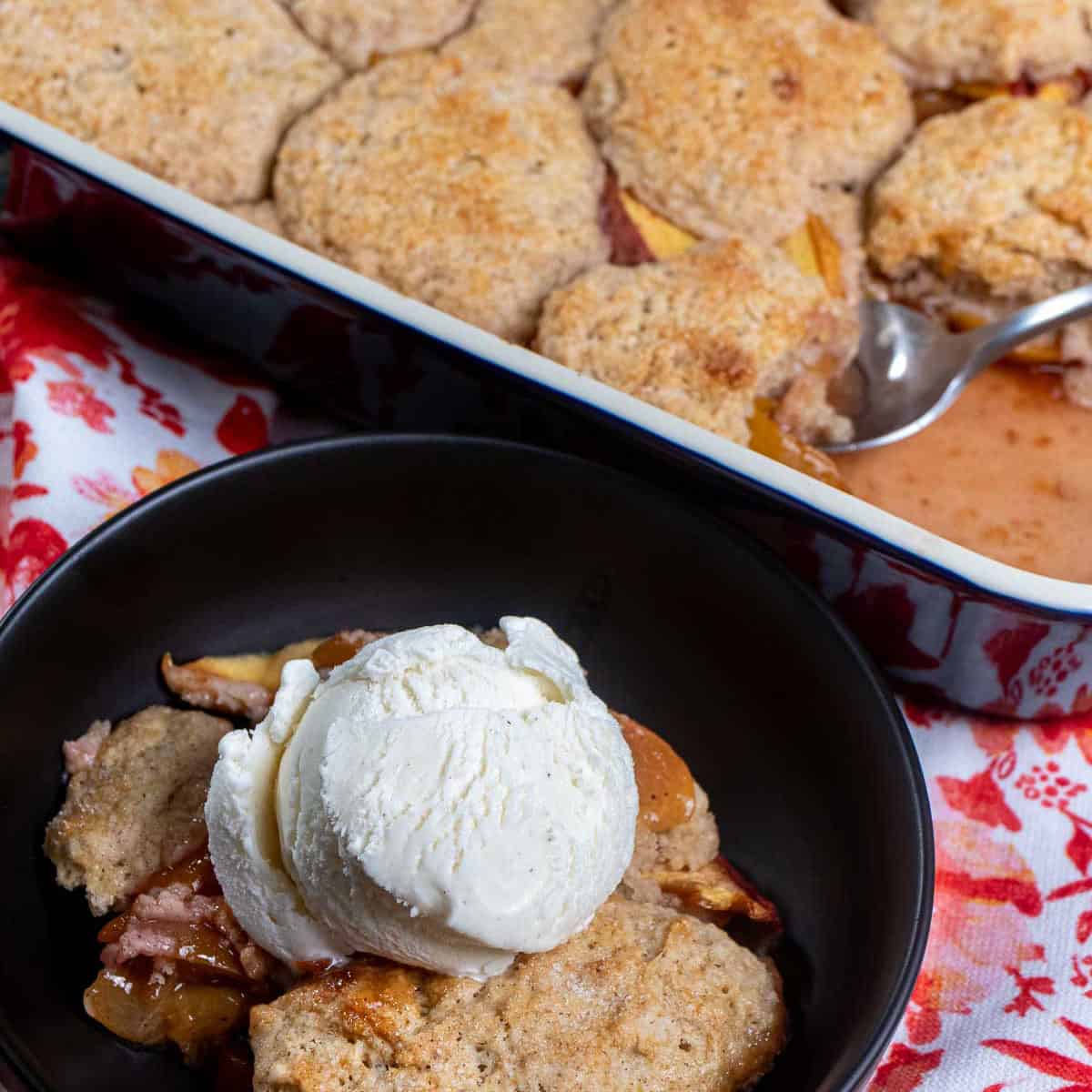1) Best Peaches – The best peaches for peach cobbler are yellow freestone peaches. These peaches have sweet but slightly firm flesh that softens nicely when baked and tend to be the best choice for any baking application. Freestone peaches also have a pit that usually comes away from the flesh more easily than clingstone peaches. White peaches tend to be a little sweeter and have a more floral taste and are better to eat fresh.When choosing peaches, look for ones that are a little firm but give slightly when squeezed and are free from bruises. They should also have a strong peach smell.2) Peeling Peaches – Peeling is totally optional and a personal preference. I usually don’t peel them, but if you want to peel them first, I recommend a serrated peeler. Another option is to bring a large pot of water to a boil. Drop the peaches in for about 30 seconds and then place in an ice-water bath. The skin should peel away by hand very easily.3) Frozen or Canned Peaches – You can use either one, but personally I don’t recommend canned peaches because they tend to already be a lot softer and can break down too much when baked in biscuit type cobblers. If using frozen, I recommend thawing and patting them dry before using in a recipe.