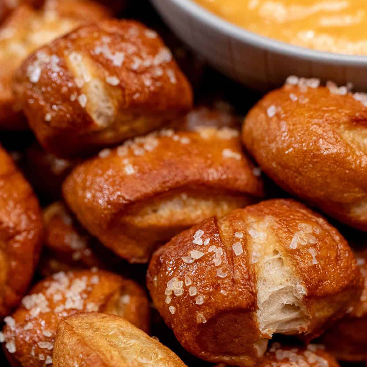 1) Egg – Making an egg wash is completely optional. The baking soda bath should give the pretzel bites a natural sheen, but if you’d like to amplify that, use an egg wash as well.2) Salt – I prefer to use kosher salt in the dough, but I like topping pretzels with coarse sea salt. If you can find it, use pretzel salt instead. Just be certain to never top with table salt. Also, top with more salt than you think you need. Some salt falls off naturally, but the salt is the main flavoring to pretzels, and they can be very bland without enough salt.3) Alkaline Bath – Without boiling or dipping pretzel dough into an alkaline solution, you lose the texture and color that makes pretzels, well, pretzels. Baking soda is an easy and safer alternative for home bakers. Making the baked baking soda is easy as well and has a pH that falls between baking soda and lye.If you would like to use lye, food-grade lye is easily found online, just be certain to read instructions and take proper precautions when using it.