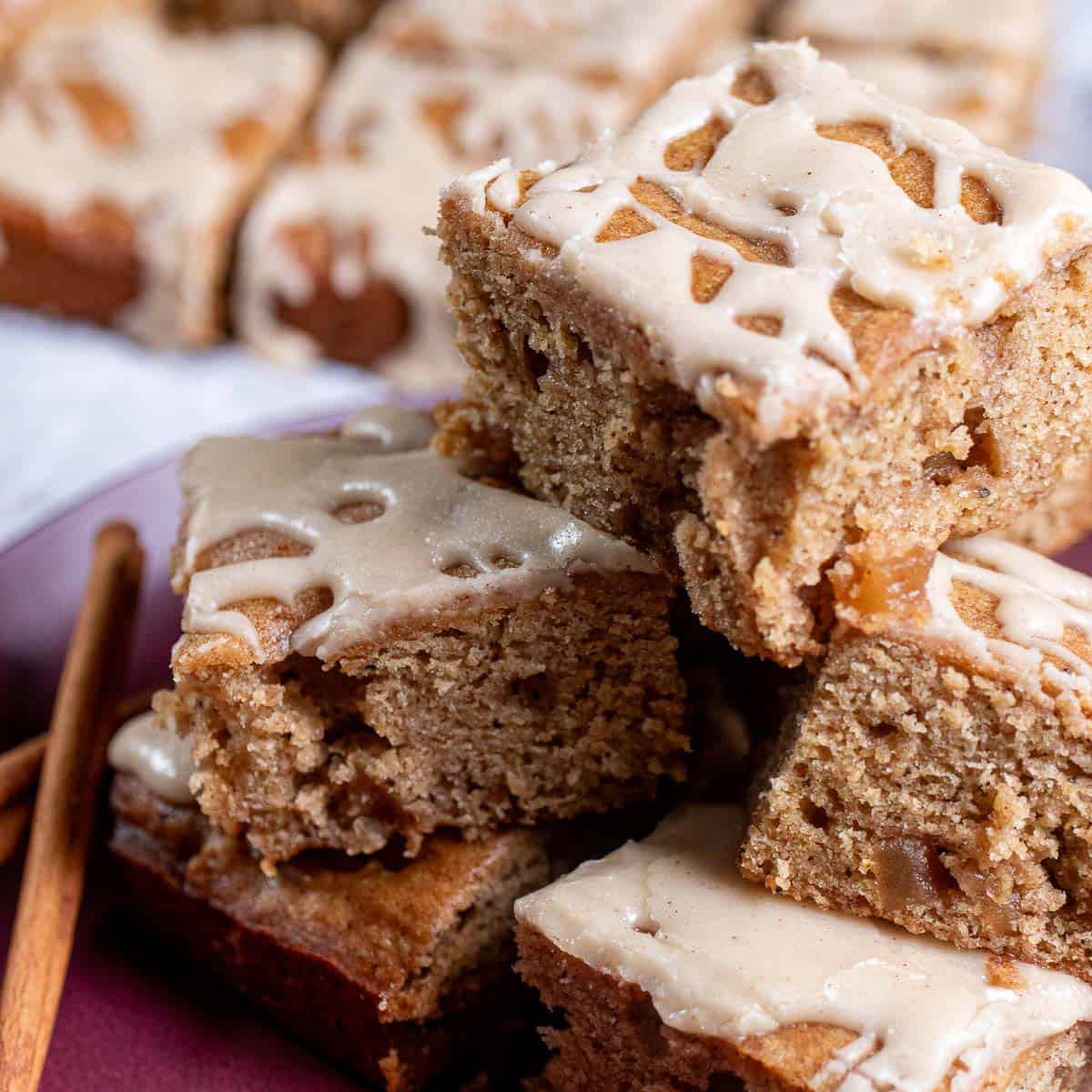 Using a spoon or squeeze bottle, drizzle the maple icing across the top of the cooled apple blondies. Remove from the pan and slice into squares for serving.