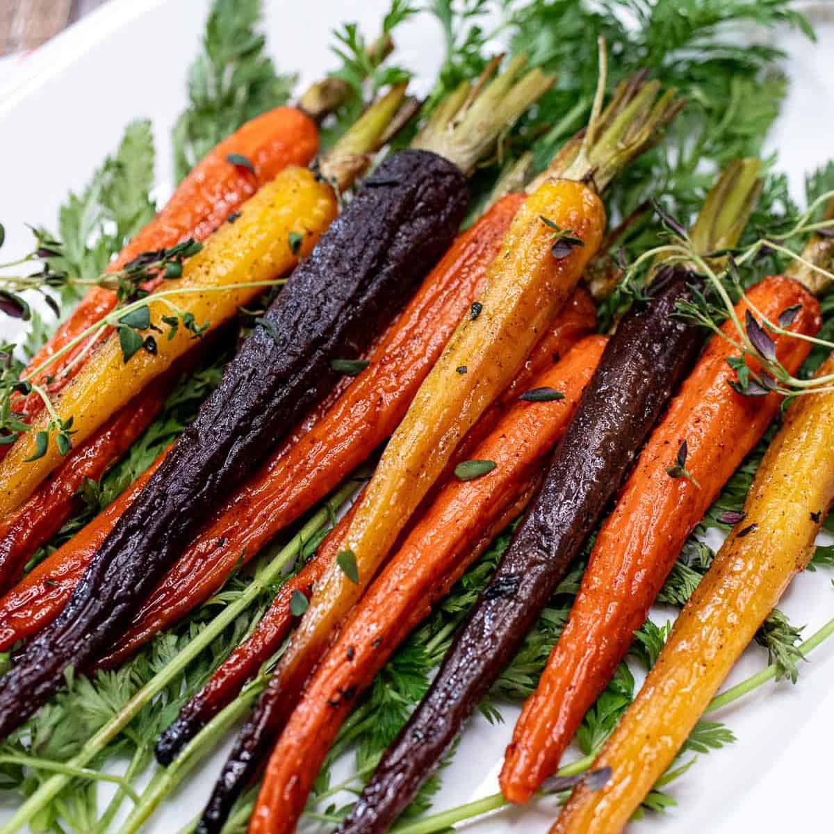 1) Carrots – Heirloom carrots can usually be found at farmer’s markets and in well-stocked grocery stores with a big produce area. You can usually find them in the organic section and sold with the carrot’s top greenery still attached. If you can’t find heirloom carrots, or wish to save money on this side dish, you can use regular orange carrots as well.If you use organic orange carrots, they tend to be a similar size and shape to the heirloom and come with their leaves attached. You can also use bagged carrots as the least expensive option. If you have large carrots with a 1-inch+ diameter, I recommend cutting them in half lengthwise to cook at the same time.2) Sheet Lining – In the photos I lined my baking sheet with foil for easier cleanup. However, I recommend using either parchment paper or ideally nothing. The carrots tended to stick to the foil in places, making them difficult to remove.3) Variations – Read the variation section above for variations like vegan, sliced or baby carrots, and alternative flavorings and seasonings.