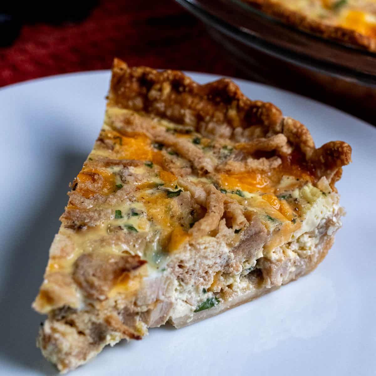 1) Turkey – Pretty much any leftover turkey should be fine here, from fried, smoked, to oven roasted. I used a mix of white and dark meat from my herb-roasted turkey here for reference.2) Stuffing – I used leftover sausage and sage stuffing in this recipe, but most stuffings and dressings should work. Using a sausage stuffing gives an added meat to contrast the turkey, which I like, but use what you have. I don’t know that a rice dressing or some seafood ones like oyster dressing would be good here though. If you try it and love it, please let me know in the comments.3) Cheese – I use a block of sharp cheddar here that I shredded myself, but most shredded cheeses should be fine. I would use a good melting cheese like cheddar, Monterey/Colby jack, Swiss, mozzarella, etc. and avoid too soft or harder cheeses.4) Milk – I find one of the best milks to use in quiche is a combination of whole milk and heavy cream. If you don’t keep those on-hand or have any left over from the holiday, however, I use half-and-half. It’s a good substitute for the above combination, and it is much less expensive.5) Baking Sheet – Placing the quiche on a hot baking sheet helps to keep the bottom crust from getting soggy. I also highly recommend using a baking sheet for the same reason I recommend them for fruit pies, to manage any spillage and keep your oven clean.6) Nutrition Info – The nutritional info provided here is a best guess average. Depending on the ingredients you use (especially the turkey and stuffing) and whether you serve in 6 or 8 slices will greatly affect the values.