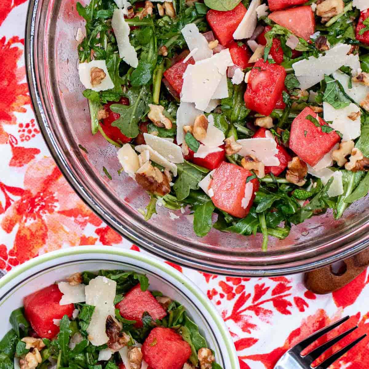 Add the arugula, 3 cups cubed watermelon, and dressing into a large, nonreactive mixing bowl and stir to combine and coat the lettuce. Sprinkle the ¼ cup shaved parmesan and ½ cup toasted walnuts on top and serve immediately.